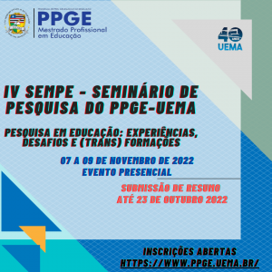 IV SEMPE – SEMINÁRIO DE PESQUISA DO PPGE-UEMA PESQUISA EM EDUCAÇÃO: EXPERIÊNCIAS, DESAFIOS E (TRANS) FORMAÇÕES de 07 a 09 de novembro de 2022 – EVENTO PRESENCIAL