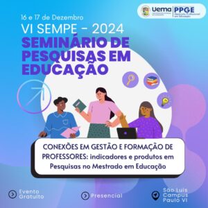 O Programa de Pós-Graduação em Educação da UEMA propõe a realização do VI SEMINÁRIO DE PESQUISA DO PPGE-UEMA. Nesta edição, pretendemos reunir investigações voltadas à temática “CONEXÕES EM GESTÃO E FORMAÇÃO DE PROFESSORES: indicadores e produtos em Pesquisas no Mestrado em Educação”.